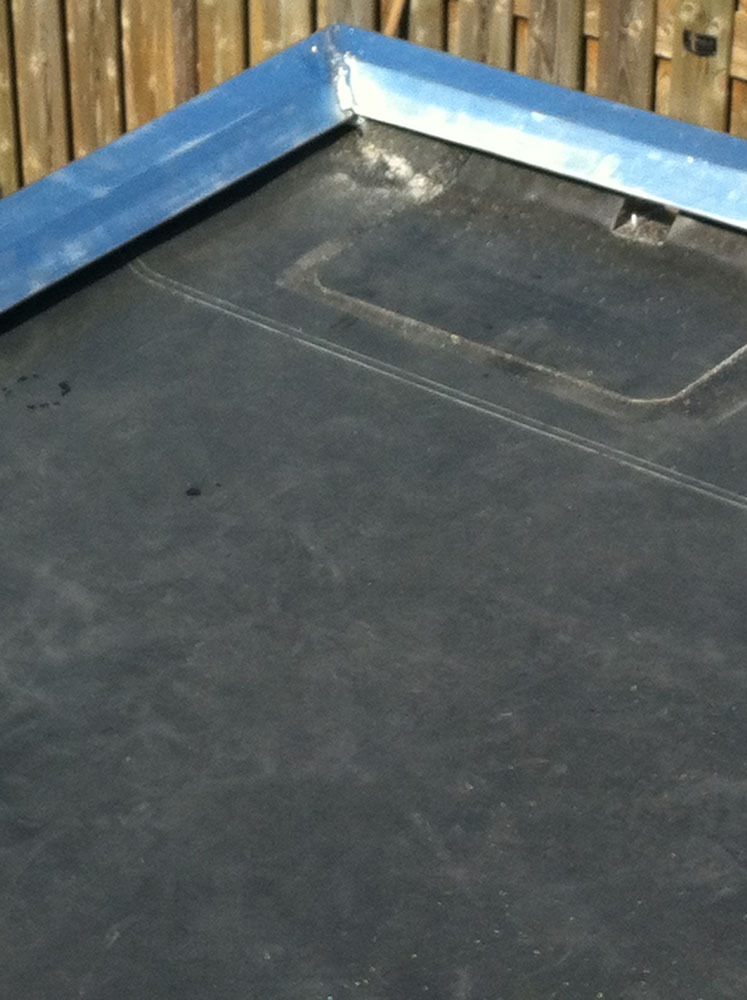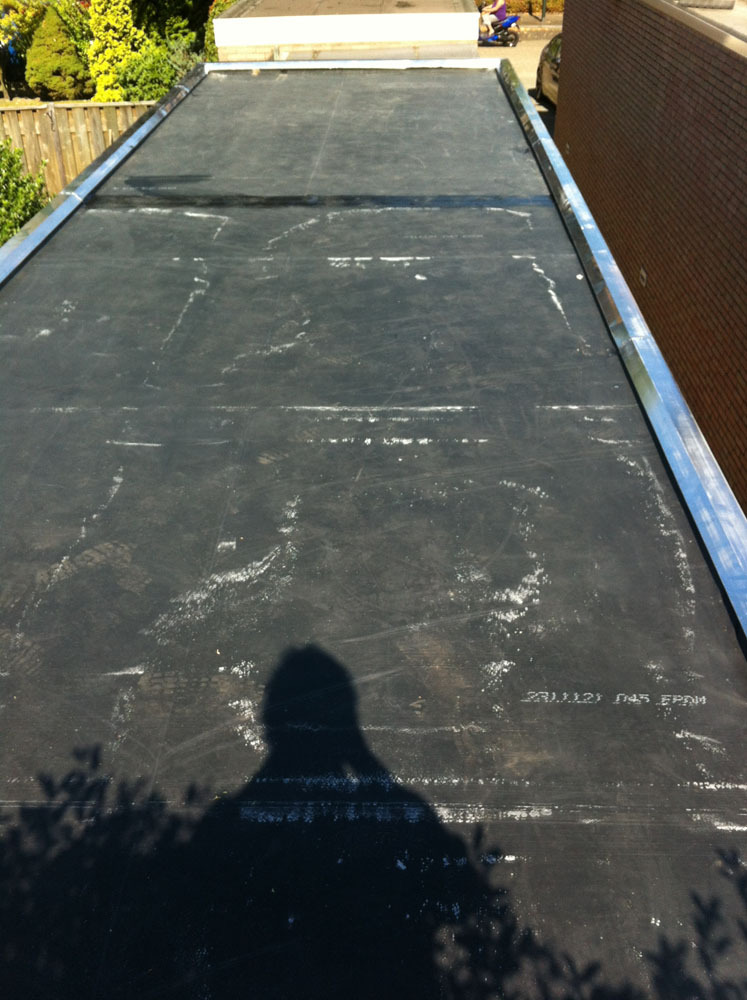 Dak voorzien van kunststof dakbedekking met zinken randafwerking te Schijndel.